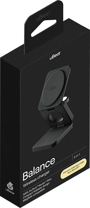 | 100% KEVLAR® | В составе uBear Kevlar® — один из самых прочных материалов современности: 100% арамидное волокно Kevlar®. По своим свойствам оно в несколько раз прочнее стали и используется в космической промышленности, а также в производстве различного рода брони. | uBear Balance — идеальный баланс между скоростью, комфортом и безопасностью беспроводной зарядки. |