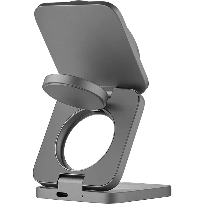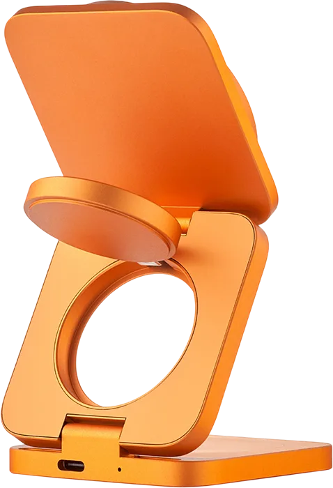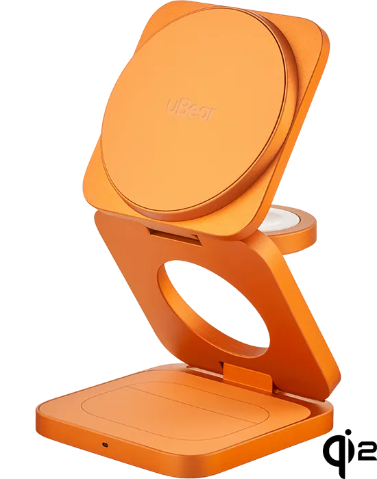| СТАНДАРТ QI2.2 | Стандарт Qi2.2 раскрывает весь потенциал беспроводной зарядки, впервые приближая ее скорость к проводным решениям. Увеличенная до 25 Вт мощность и безупречное магнитное соединение позволяют заряжать новейшие iPhone не только удобно, но и максимально быстро. | Три устройства — одна компактная станция без лишних проводов |