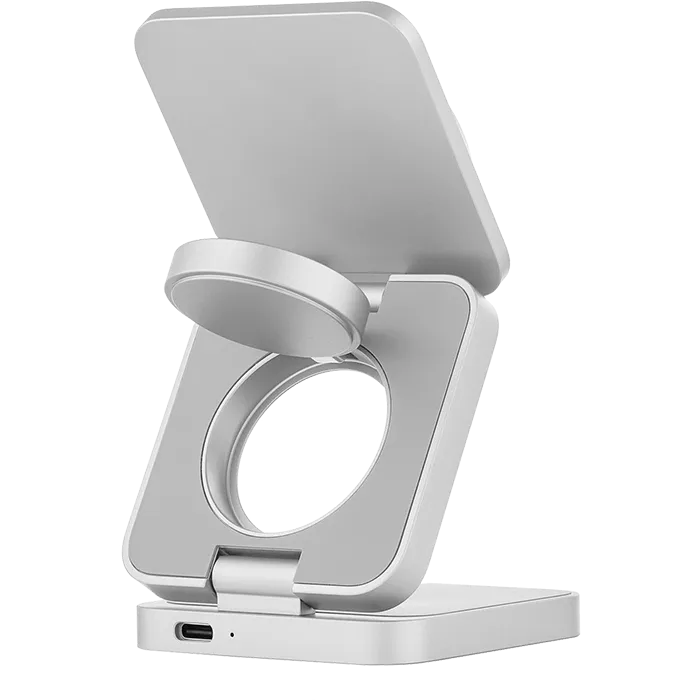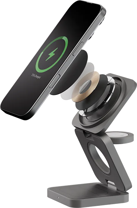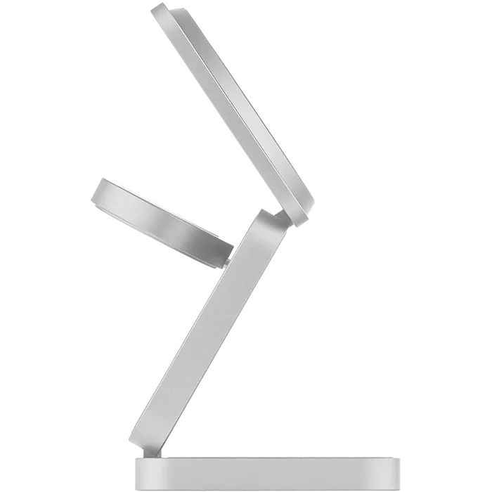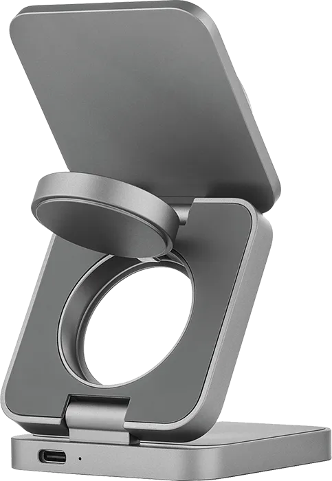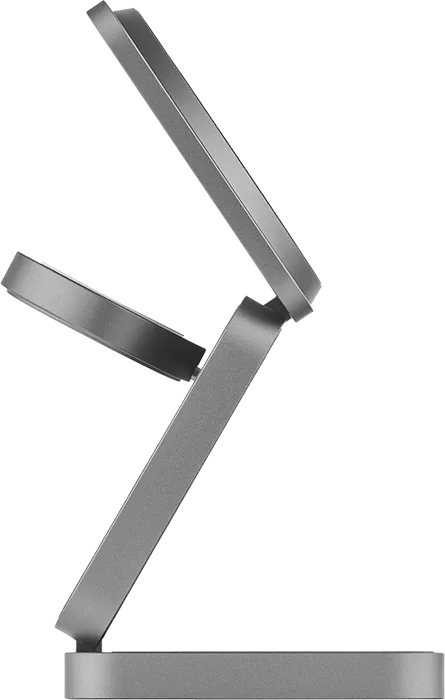 | В 2 РАЗА БЫСТРЕЕ | При общей мощности 25 Вт и поддержке нового стандарта Qi2 станция эффективно распределяет энергию между устройствами без потерь. iPhone получает до 15 Вт мощности, заряжаясь вдвое быстрее, чем на беспроводных станциях предыдущего поколения. При этом наушники и часы продолжают получать оптимальную мощность по 5 Вт. |