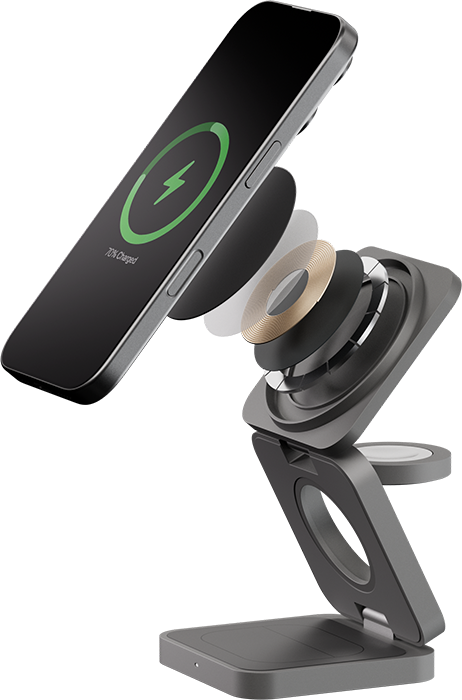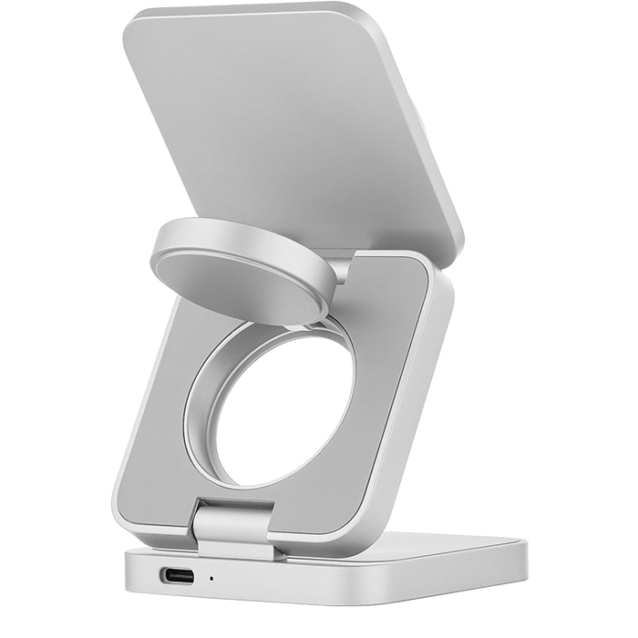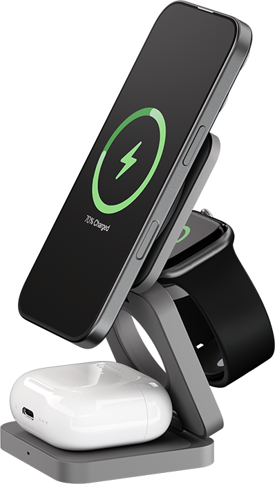 | В 2 РАЗА БЫСТРЕЕ | При общей мощности 25 Вт и поддержке нового стандарта Qi2 станция эффективно распределяет энергию между устройствами без потерь. iPhone получает до 15 Вт мощности, заряжаясь вдвое быстрее, чем на беспроводных станциях предыдущего поколения. При этом наушники и часы продолжают получать оптимальную мощность по 5 Вт. |
