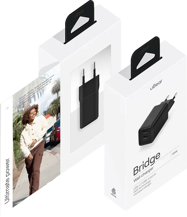 | ТОЛЬКО ИННОВАЦИИ | В зарядном устройстве использован продвинутый транзистор на основе нитрида галлия (GaN). Он позволяет снизить размеры зарядного блока и заряжать устройства быстрее на большей мощности. Кроме того, он снижает перегрев, что исключает возможность деформации пластиковых частей корпуса. Чипы такого уровня используют лишь ведущие производители техники, например, Apple или разработчики оборудования для сетей 5G. | uBear — это бренд для всех, кто живет полной жизнью, заряжаясь энергией большого города. |