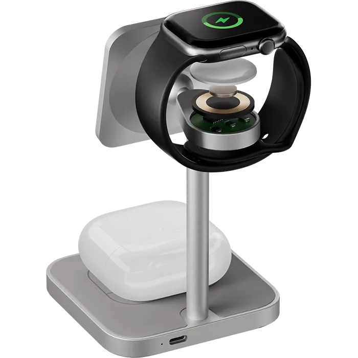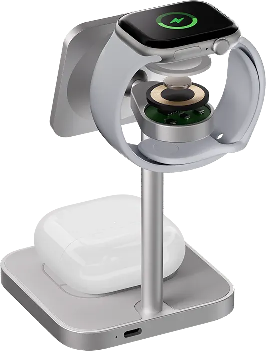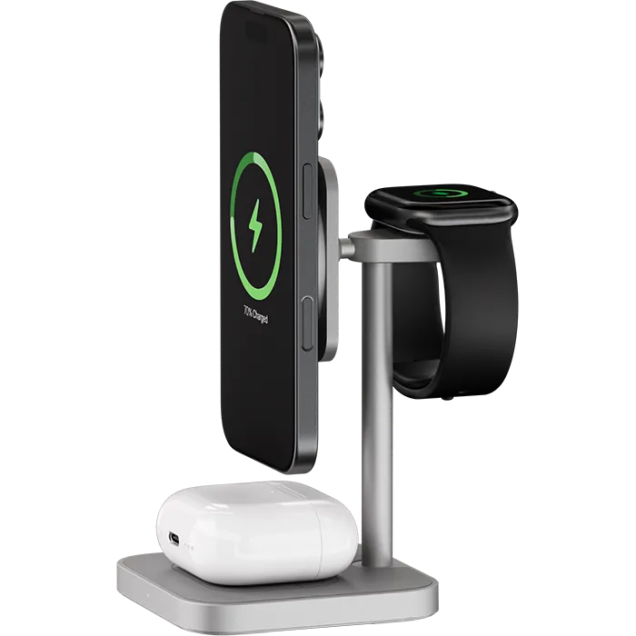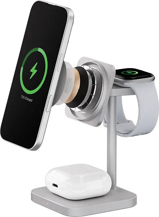 | ПОДДЕРЖКА MAGSAFE | Эргономичное беспроводное зарядное устройство с поддержкой Qi2 и MagSafe, идеально подходит для одновременной и эффективной зарядки трёх Apple-устройств. С мощными магнитами крепление iPhone (с 12-й серии и выше) будет удобным, с мгновенным подключением — зарядка начинается с первого прикосновения. |