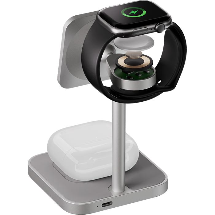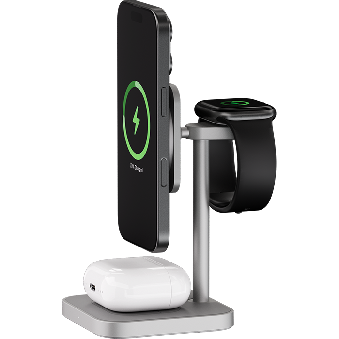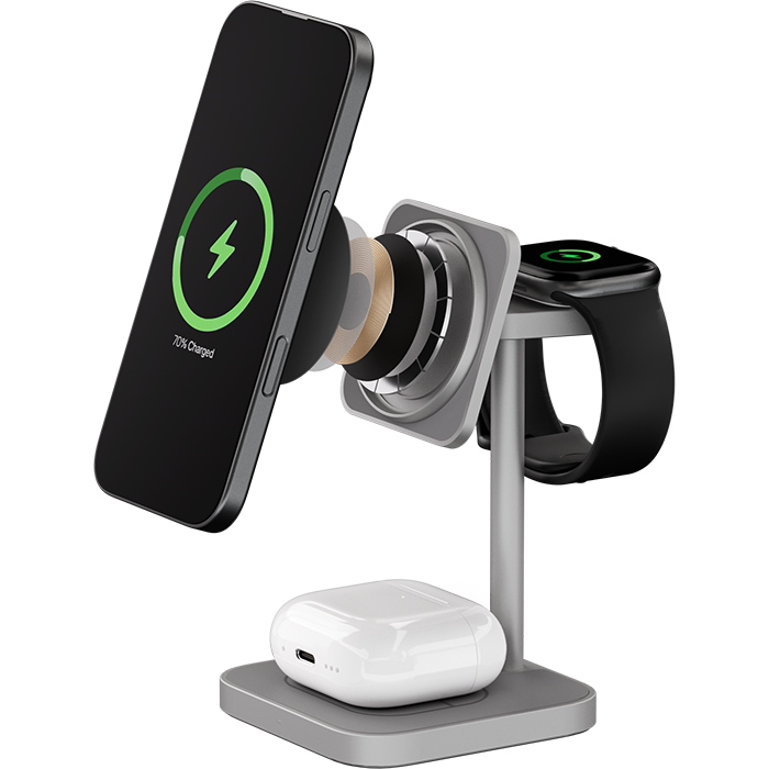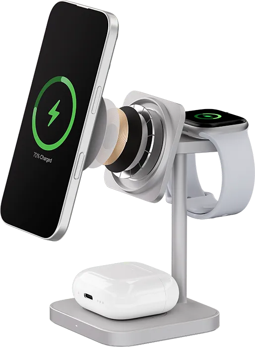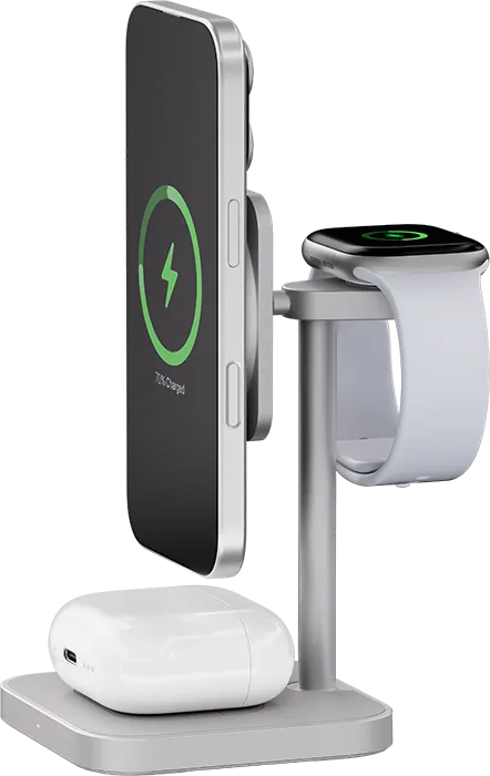 | ПОДДЕРЖКА MAGSAFE | Эргономичное беспроводное зарядное устройство с поддержкой Qi2 и MagSafe, идеально подходит для одновременной и эффективной зарядки трёх Apple-устройств. С мощными магнитами крепление iPhone (с 12-й серии и выше) будет удобным, с мгновенным подключением — зарядка начинается с первого прикосновения. |