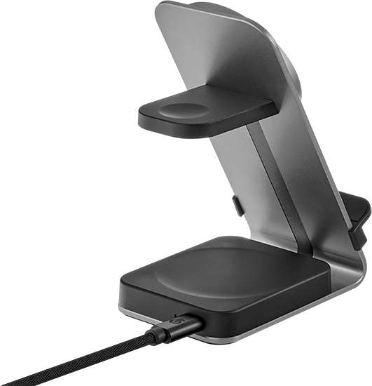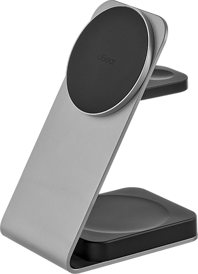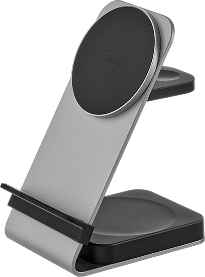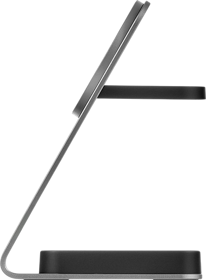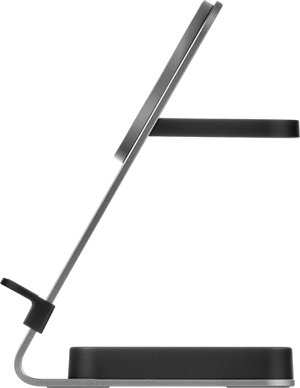 | ДИЗАЙН | Эргономичный корпус из авиационного алюминия уверенно фиксируется на любой ровной поверхности. Смартфоны, не поддерживающие магнитное крепление, могут быть зафиксированы с помощью съёмной подставки, входящей в комплект. Зарядные панели покрыты нескользящим и приятным на ощупь покрытием Soft Touch. |