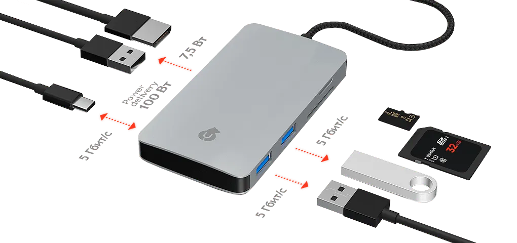 | Поддержка функций | USB 3.0 x 3: передача данных Super Speed (5Gbps), совместим с USB 2.0 USB-A х 1 поддержка BC 1.2, с возможностью зарядки до 7.5 Вт (5В/1.5А) USB 3.0 x 3: одновременная зарядка и передача данных HDMI: разрешение до 4Kx2K@30Hz USB-C выход: одновременная передача данных по протоколу USB 3.0 (5Gbps) и зарядка PD до 100Вт (20В/5А) USB-C: поддержка функции «plug and play», «hot swap» SD card: Secure Digital v3.0 UHS-I (Ultra High Speed): SDR12 (12.5Mbyte/s)/SDR25(25Mbyte/s)/SDR50(50Mbyte/s)/DDR50(50Mbyte/s)/SDR104(104Mbyte/s) USB PD 3.0: Fast Role Swap |