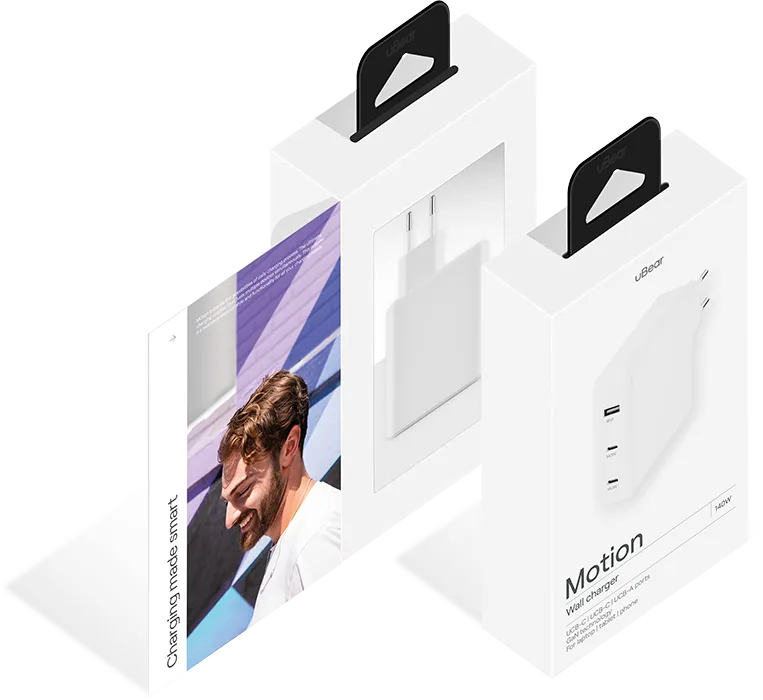 | МОЖНО ПОЛОЖИТЬСЯ | Несмотря на высокую производительность, устройство на 30% меньше стандартных аналогов. А многоуровневая защита от перегрева, короткого замыкания и скачков напряжения делает использование абсолютно безопасным. | uBear Motion — мощная зарядка, которая всегда под рукой. |