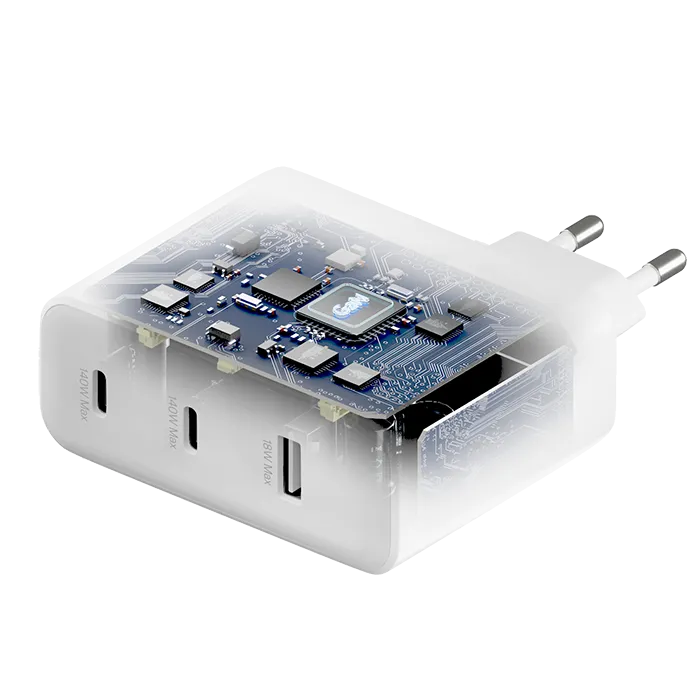 | МОЩНОСТЬ НОВОГО ПОКОЛЕНИЯ | Чип на основе нитрида галлия (GaN) — это прорывная технология, позволяющая добиться невероятной мощности 140 Вт в компактном корпусе. По сравнению с привычными кремниевыми чипами GaN обеспечивает лучшую энергоэффективность, меньше нагревается и продлевает срок службы устройства — это не просто тренд, а новый стандарт зарядных устройств. | |