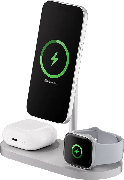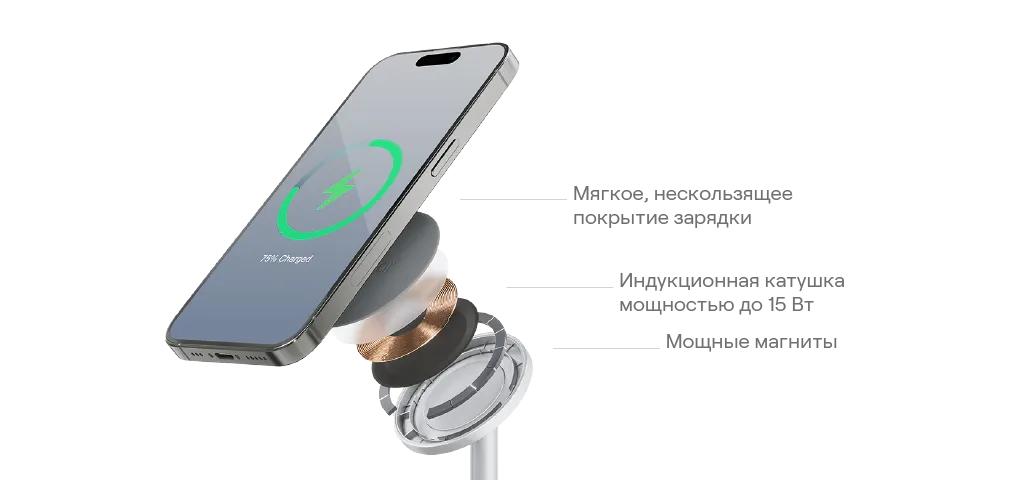 | MAGSAFE СОВМЕСТИМ | Технология Qi2 обеспечивает общую мощность до 25 Вт, что вдвое ускоряет зарядку iPhone 12 и новее (15 Вт вместо 7,5 Вт). Благодаря современным индукционным катушкам возможна эффективная зарядка всех QI-совместимых устройств. Магнитный держатель позволяет быстро закрепить iPhone одним движением. | STAGE ULTRA — стильное и надёжное решение на каждый день. |