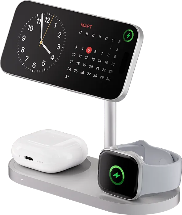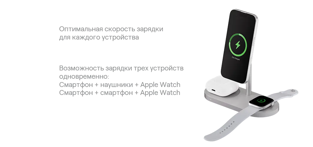 | ЭРГОНОМИКА | Продумана до мелочей: продолжайте пользоваться устройством при зарядке, либо закрепите его на станции и контролируйте процесс зарядки визуально. Лаконичный световой индикатор информирует о прогрессе, не привлекая к себе лишнего внимания. Нескользящее дно обеспечивает устойчивость док-станции, а значит и сохранность ваших устройств. |