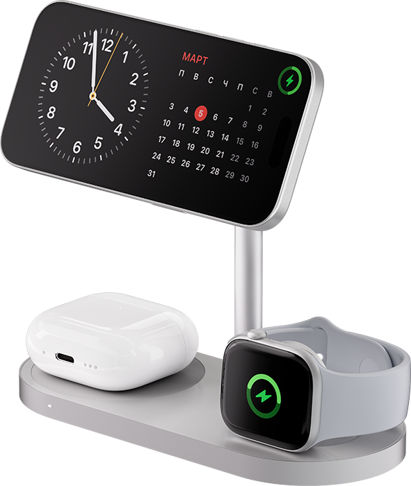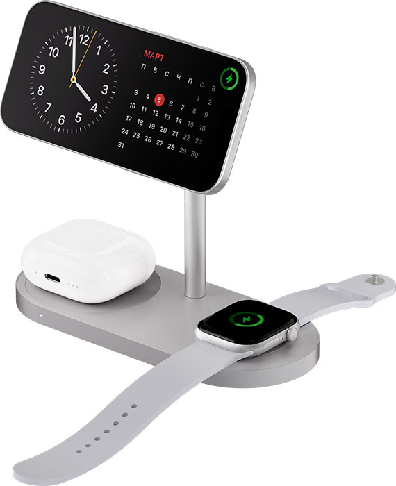 | ЭРГОНОМИКА | Продумана до мелочей: продолжайте пользоваться устройством при зарядке, либо закрепите его на станции и контролируйте процесс зарядки визуально. Лаконичный световой индикатор информирует о прогрессе, не привлекая к себе лишнего внимания. Нескользящее дно обеспечивает устойчивость док-станции, а значит и сохранность ваших устройств. |