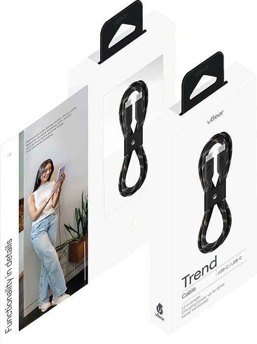 | УСИЛЕННЫЕ КОННЕКТОРЫ | От качества коннекторов напрямую зависит срок эксплуатации кабеля. Коннекторы uBear Trend имеют удлинённую форму и прочный материал, с которыми кабель под надёжной защитой даже при интенсивном воздействии. Гибкое основание коннекторов позволяет менять положение кабеля, а покрытие Soft-touch делает приятным каждое касание. Кабель выдерживает до 10 000 сгибаний. | uBear Trend — премиальное качество всегда в тренде. |